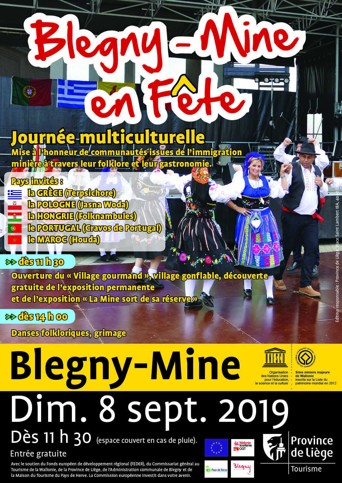 Fort du succès rencontré lors des éditions précédentes, Blegny-Mine vous convie à nouveau le dimanche 8 septembre 2019, dès 11h30, à sa journée multiculturelle où seront mises à l’honneur à travers leur folklore et leur gastronomie, différentes communautés migrantes ayant travaillé à Blegny-Mine.