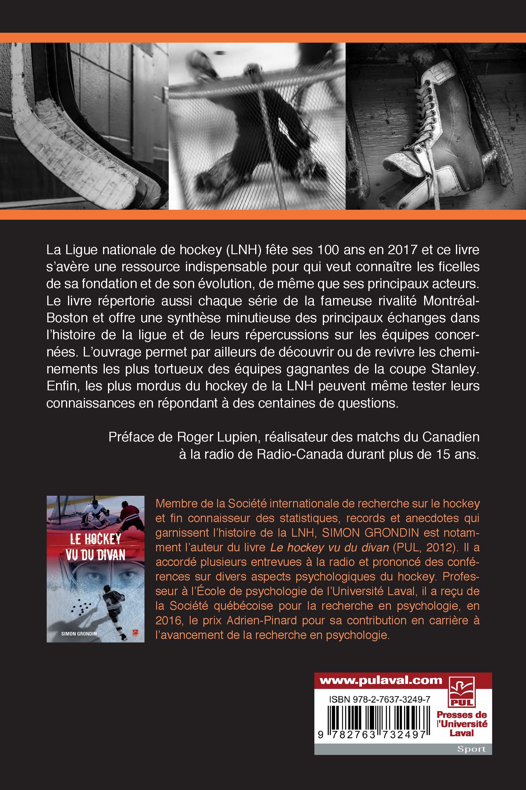 La Ligue nationale de hockey (LNH) fête ses 100 ans en 2017 et ce livre s’avère une ressource indispensable pour qui veut connaître les ficelles de sa fondation et de son évolution, de même que ses principaux acteurs. Le livre répertorie aussi chaque série de la fameuse rivalité Montréal-Boston et offre une synthèse minutieuse des principaux échanges dans l’histoire de la ligue et de leurs répercussions sur les équipes concernées. L’ouvrage permet par ailleurs de découvrir ou de revivre les cheminements les plus tortueux des équipes gagnantes de la coupe Stanley. Enfin, les plus mordus du hockey de la LNH peuvent même tester leurs connaissances en répondant à des centaines de questions.